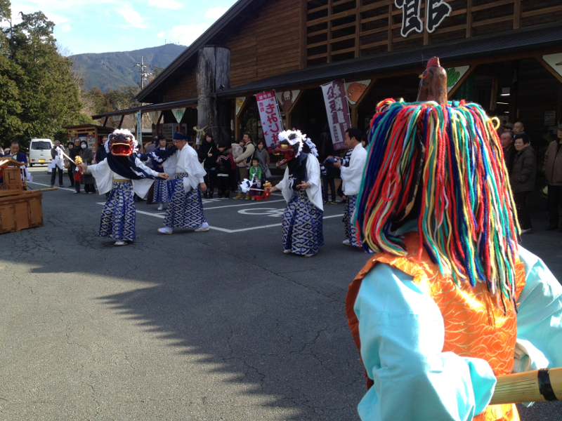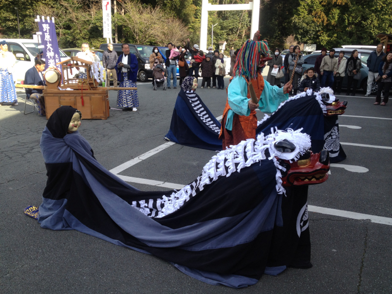 お宮への入り口付近では、新年ということもあって集まった人向けに獅子舞が披露されていた。調べてみると、この獅子舞はこの地域(大紀町)の伝統芸能である野原大神楽というものらしく、壬申の乱に由来する由緒正しいものだという。