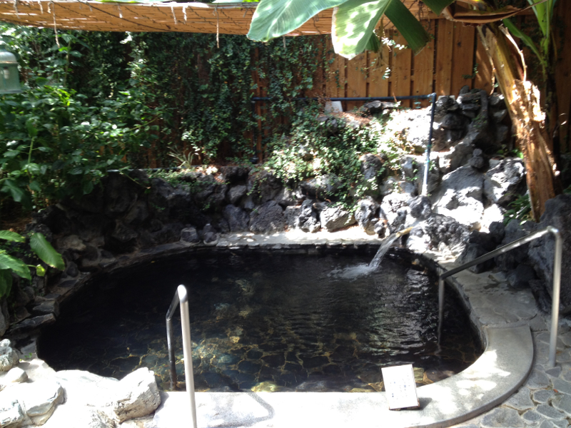 中に入ると、暑い夏場だからか、冷房がガンガンに効いている。700円を払って中へ。平日の日中ということもあってか、自分以外に客はおらず貸し切り状態。それはいいのだが、肝心の温泉は風情がないというか、ビニールハウスのような作りで、浴室は蒸し蒸しするし、中に植えられた植物も南国テイストのあるものばかり。