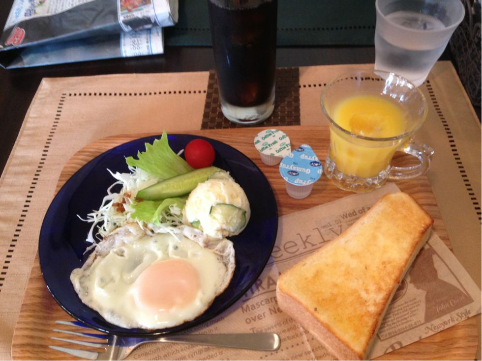 目玉焼き、サラダ、トースト、ドリンク(なぜかコーヒー以外にオレンジジュースがついてくる)のモーニング(400円)を食べながら、本日の計画を立てる。