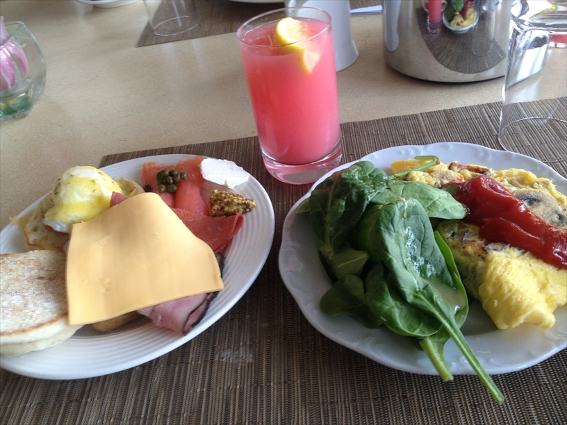 ハワイ島は朝早くから行動するのがいいらしいので、全日程で早めに行動をスタート。フェアモントオーキッドは抜けるような青空のもと、オープンテラスで食事ができる。小鳥も近くに寄ってきたりして、いい雰囲気。まあ、4日も続けて食べると、バリエーションがなくて飽きてくるんだけど、初日はさすがに興奮気味に食べてしまった。