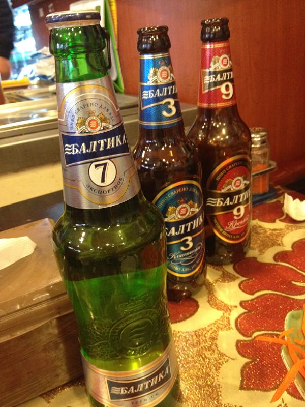まずはバルティカビールで乾杯。バルティカビールは1990年に製造開始されたロシア・サンクトペテルブルグのビールで、No.0~No.9までの種類のある銘柄。No.0はアルコール度がゼロで、数字が挙がっていくごとにアルコール度数もあがっていくというシステム。今回はNo.3、No.7、No.9を注文。N0.3はアルコール度4%程度。いちばん口当たりがよくて飲みやすかった。No.7はプレミアムと表記されていたが、ややライトな味わいでとくにプレミアムな感じはせず。No.9はさすがに8%超えしているだけに、アルコールを強く感じる味だった。これらが同じ5000wで販売されているのは、良心的過ぎる気が。