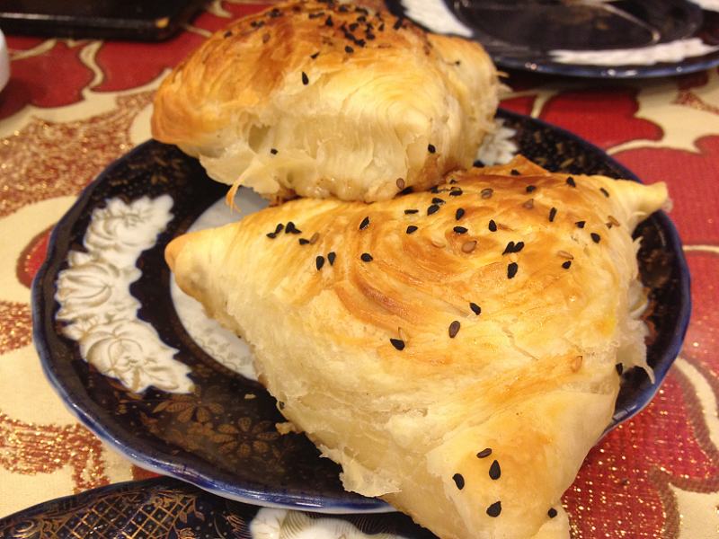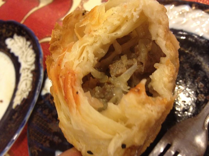 残念ながら、夜に食事する用事があったので料理は軽く頼むことにした。最初はサモサを注文。ひとつ3000w。実に安い。サモサというとインド的な餃子をイメージしたが、ウズベキスタンのサモサはサクサクのパン生地(やや大きめ)の中に羊肉のミンチと玉ねぎがぎっしり詰まっている食べ物だった。これとチリソースを合わせると最高に旨い。