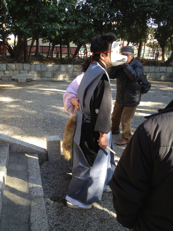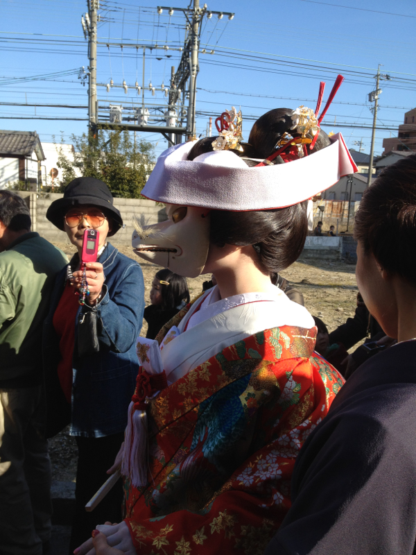新婦役の狐の面は迫力があって怖い。嫁入りの行事では神社の周囲を練り歩くんだけど、別にガードマンがいるわけでもないから、新郎・新婦の後について練り歩くことも可能で、まるで自分も行列に参加している感じで楽しかった。