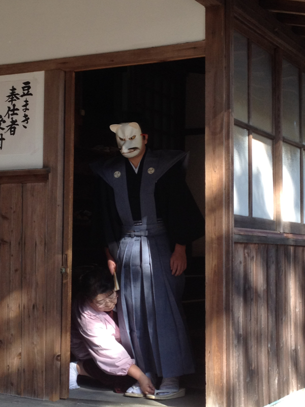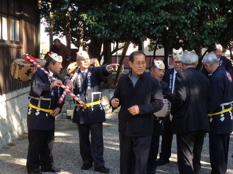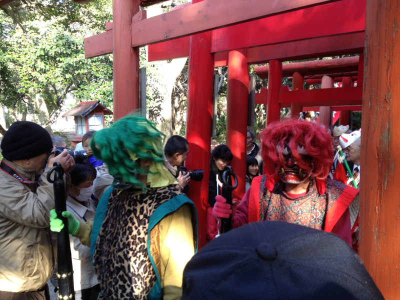 海山道(みやまど)神社は、稲荷神社なので狐ということなんだろうが、なんで嫁入りを節分にやるのかまでは知らん。狐のお面を付けた新郎新婦が赤鬼と青鬼に先導されて、道中を練り歩くという儀式。狐の夫婦役は毎年氏子の厄年に当たる人物から選ばれるという。
