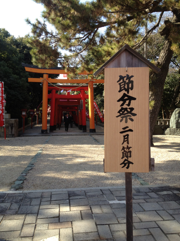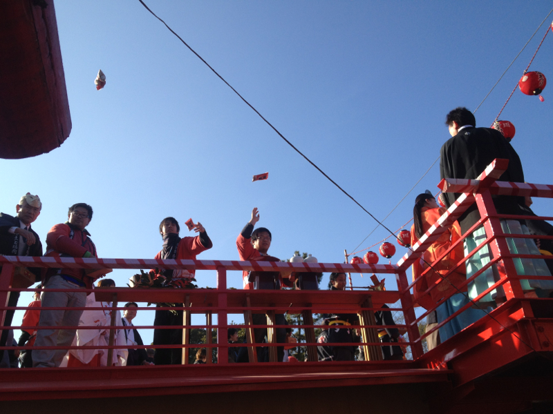 境内に戻ってきたら、櫓の上で三三九度の杯を交わし、節分の豆まきを行う。大人も必死で豆の争奪戦に参加するので、豆が飛んでくるあたりは大混雑。そんなに必死で参加してはいなかったが、運良く自分たちのところに豆が飛んできて豆を取れたのはラッキーだった。