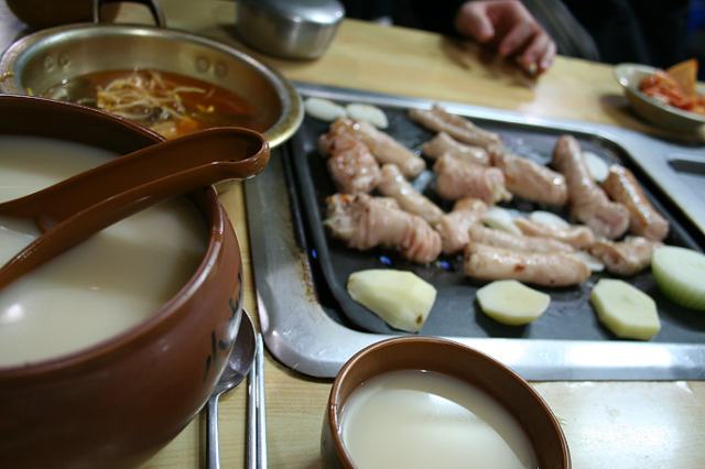 マッコリを頼んだのだが、内蔵には焼酎のような透明度のある酒の方が合うな。韓国でマッコリは安いのだが、これで300円ってのも安すぎ。全部飲めなかったよ。