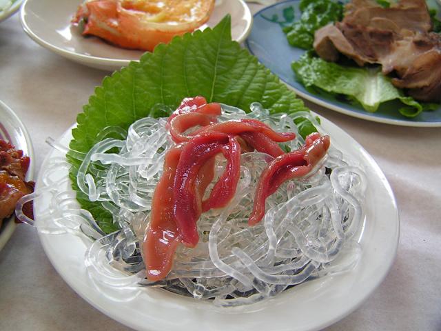60807433_59.jpg韓国語では『ケブル』と言うのだが、見た目はもう・・・アレとしか言い様のないモノ。写真見てもらったら分かると思う。見た目は本当に気持ち悪い。こんなもの食えるかーッ!って思うけど、実際食べてみるとアラ不思議。やわらかそうな見た目と違ってコリコリとしたいい味わいで、美味しい(´・ω・`)うん……。調理している場面は男として絶対見たくないけど・・・。焼酎のアテに悪くないのだ。