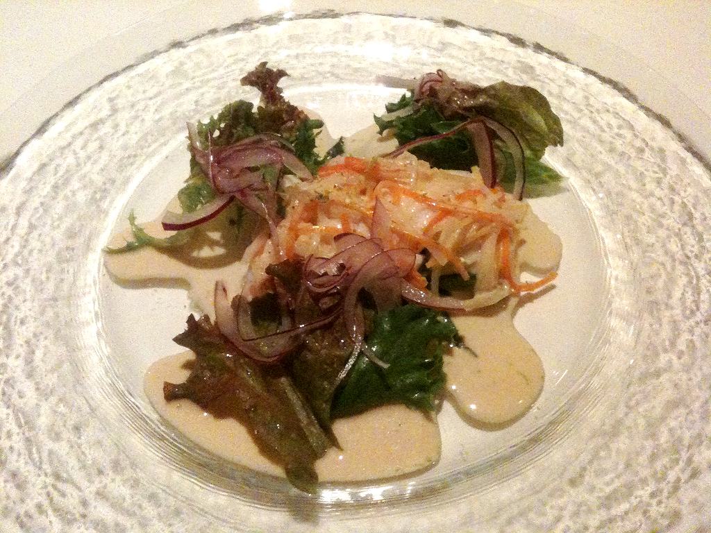 食事会は3時間コースでゆっくり会話を楽しみながらできるものでした。こちらはサーモンとポテトの食感が楽しめる一品。