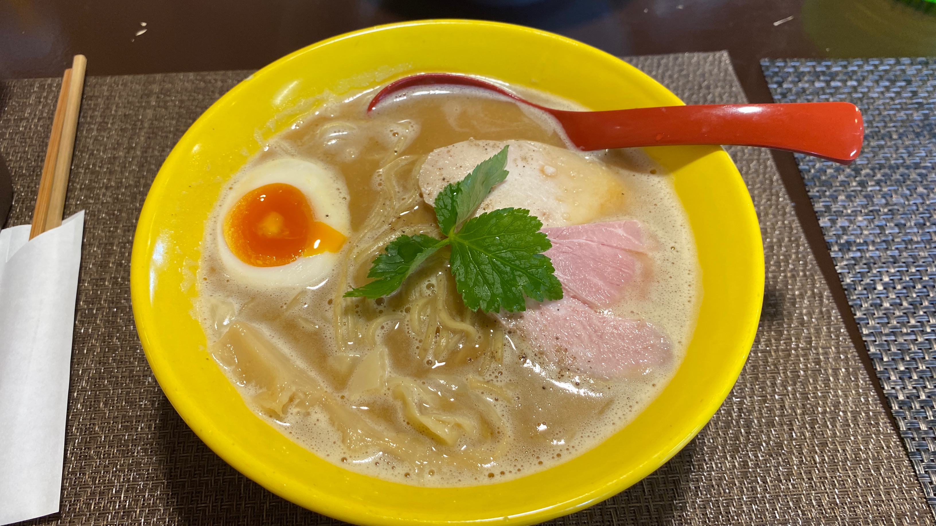 ランチは少し遠出して、中川区の親孝行へ。美味そうなんだけど、実際食べるとそこまでではないので頻繁には行かないのだが、箱が大きく家族連れにはやさしい店舗なので足が向いた。久しぶりに行ったが、メニューが絞られてて3種類ぐらいしかなかった。息子は鶏そばの塩、自分は鶏白湯の生醤油、嫁さんは塩の鶏白湯。